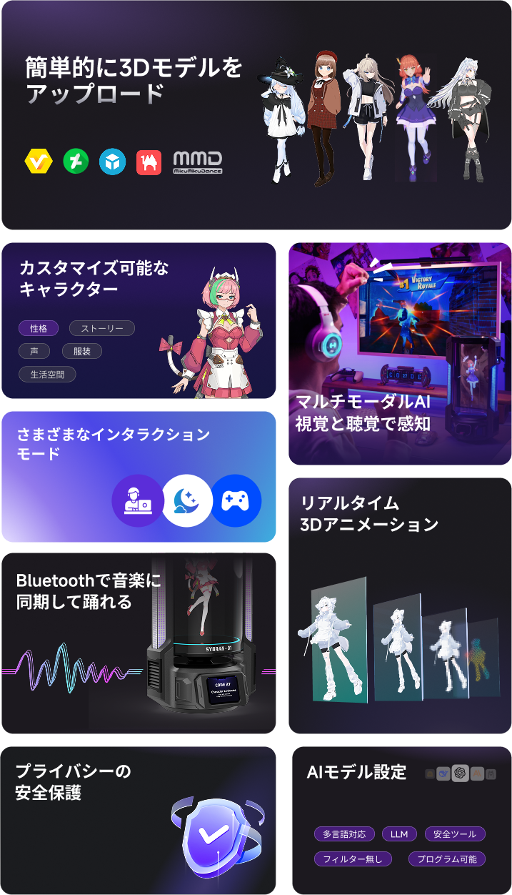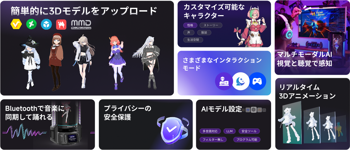 キャラクターを自由にカスタマイズ:お好きな3Dモデルをアップロードするだけで、会話内容に合わせた動きや表情でキャラクターが生き生きと動き出します。